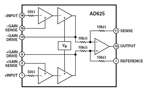 AD625AD features: (1)User Programmed Gains of 1 to 10,000; (2)Low Gain Error: 0.02% Max; (3)Low Gain TC: 5 ppm/℃ Max; (4)Low Nonlinearity: 0.001% Max; (5)Low Offset Voltage: 25 μV; (6)Low Noise 4 nV/√Hz (at 1 kHz) RTI; (7)Gain Bandwidth Product: 25 MHz; (8)16-Lead Ceramic or Plastic DIP Package, 20-Terminal LCC Package; (9)Standard Military Drawing Available; (10)MlL-Standard Parts Available; (11)Low Cost.