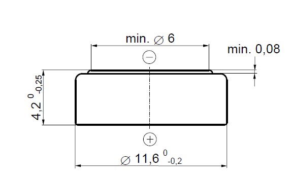 LR1120 features: (1)Chemical system Zinc / Manganese Dioxide, high drain; (2)Nominal Voltage 1,5 V; (3)Capacity 73 mAh, Discharge over 5,62 kΩ at 20℃ to 0,9 V; (4)Internal Resistance Below 20 Ω at 20℃; (5)Operating Temperature 0℃ – 60℃; (6)Self Discharge Less than 10% per year at 20℃; (7)Weight ~1,36 g.